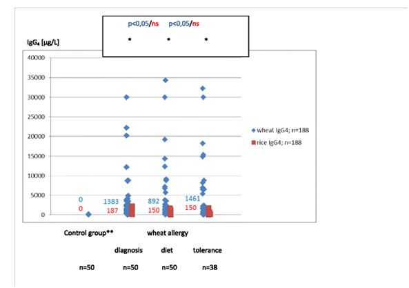 ①背景食物sIgG和sIg G4具有高度的個體多樣性。我們假設(shè),胃腸道炎癥的存在是導(dǎo)致其產(chǎn)生的原因之一。本研究的目的是:1、對以下幾組兒童樣本進(jìn)行小麥和大米sIgG和sIgG4分析:健康兒童、IgE介導(dǎo)的小麥過敏(WA)、乳糜瀉(CD)和幽門螺桿菌感染(HP)。2。評價小麥sIgG和sIgG4檢測在小麥過敏診斷中的適用性。②我們比較了200名兒童的小麥和大米sIgG和sIgG4(總計388項): 50 例小麥過敏(診斷、飲食治療、耐受)、50乳糜瀉(診斷和緩解)、50 幽門螺桿菌感染(HP)和50 例健康人。采用FEIA法(Pharmacia CAP系統(tǒng))測定SIgE、sIgG、sIgG4。