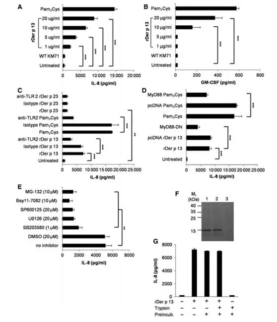 ① 屋塵螨(HDM)變應(yīng)原Der p 13可能是一種脂結(jié)合蛋白,能夠激活啟動變應(yīng)反應(yīng)的關(guān)鍵先天信號通路;② 純化的rDer p 13通過質(zhì)譜、圓二色性、基于熒光的脂質(zhì)結(jié)合分析和硅結(jié)構(gòu)預(yù)測等方法來進(jìn)行表征分析;③ 采用ELISA、嗜堿性粒細(xì)胞脫顆粒試驗和體外氣道上皮細(xì)胞活化試驗檢測Der p 13的IgE結(jié)合活性和致敏活性;④ 熒光脂質(zhì)結(jié)合試驗證實,該蛋白質(zhì)對配體具有高度選擇性,并且它與脂肪酸結(jié)合具有典型的脂質(zhì)轉(zhuǎn)運(yùn)蛋白解離常數(shù);⑤ Der p 13 通過其脂質(zhì)結(jié)合能力,并由TLR2激活,然后在HDM過敏反應(yīng)中起作用。