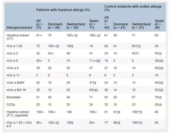 ①對榛子的食物過敏同時伴或不伴花粉過敏。②我們試圖在西班牙、瑞士和丹麥三個國家中評估一組榛子過敏原,用于榛子過敏的診斷。③52例對榛子雙盲、安慰劑對照食物挑戰(zhàn)試驗結(jié)果呈陽性的患者;5例有過敏反應(yīng)史;花粉過敏但榛子耐受62例;63例非特應(yīng)性受試者作為對照。采用ImmunoCAP法對榛子提取物、重組榛子過敏原(rCor a 1.04、rCor a 2、rCor a 8、rCor a 11)、天然過敏原(nCor a 9、nCor a Bd8K、nCor a Bd11K)的血清特異性IgE水平進(jìn)行分析。