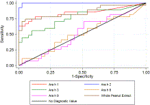 We compared the diagnostic performance of sIgE measurement to different components and whole extract in discriminating between subjects with peanut allergy and those tolerant to peanut using receiver operating characteristic (ROC) curve analysis6x6Zweig, M.H. and Campbell, G. Receiver-operating characteristic (ROC) plots: a fundamental evaluation tool in Clinical Medicine. Clin Chem. 1993; 39: 561–577