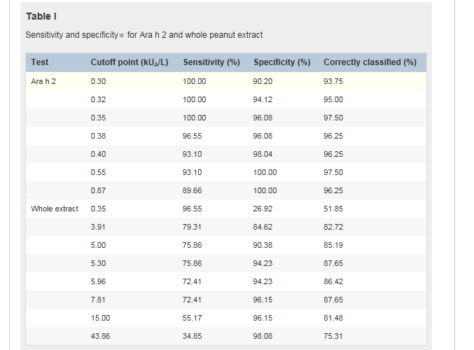 Abstract | Full Text | Full Text PDF | PubMed | Scopus (291) | Google ScholarSee all References we have now demonstrated the value of its quantification using a routinely available laboratory test. Among school-aged children in the United Kingdom, a cutoff of 0.35 kUA/L Ara h 2 IgE confers 100% sensitivity and 96.1% specificity. By using this cutoff point, 97.5% of the subjects in our study population were correctly classified, with all children with peanut allergy given the correct classification. The importance of Ara h 2 has been suggested in studies from other Central and Northern European countries7x7Astier, C., Morisset, M., Roitel, O., Codreanu, F., Jacquenet, S., Franck, P. et al. Predictive value of skin prick tests using recombinant allergens for diagnosis of peanut allergy. J Allergy Clin Immunol. 2006; 118: 250–256