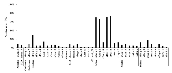 結(jié)果:在ISAC中,nDer f 1(71.9%)、rDer f 2(73.7%)、nDer p 1(70.2%)和rDer p 2(66.7%)的致敏率最高,而rDer p 10和其他貯藏螨組分的陽性率僅為10%。rFel d 1和rCan f 1分別在29.8%和14.0%的樣本中呈陽性。其他動物皮屑的陽性率均低于7.0%。對花粉組分的致敏主要為nCyn d 1(17.5%)和nPhl p 4(12.3%),4例nPhl p 4、nCyn a 2陽性、 nCyn d 1(CCD)陽性,均合并哮喘和鼻炎。對霉菌(rAsp f 3)、蟑螂(nBla g 7)和單線蟲(rAni s 3)的敏感性相同,為8.8%。93.0%的患者對一種以上的組分敏感,其中有一半以上(57.9%)對五種或五種以上的組分呈陽性。合并哮喘和鼻炎患者(AA + AR)比僅哮喘患者(AA)對更多的組分敏感。AA + AR患者的nPhl p 4陽性率顯著高于僅AA患者(χ2 = 4.31,P = 0.038)。