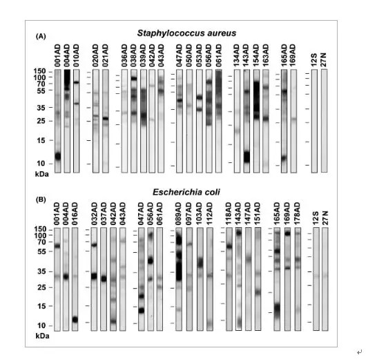 用IgE免疫印跡法對179例AD患者血漿標(biāo)本進(jìn)行微量屋塵螨變應(yīng)原分子及金黃色葡萄球菌和大腸桿菌抗原的IgE反應(yīng)性分析。檢測金黃色葡萄球菌和大腸桿菌抗原特異性抗體與印跡在硝酸纖維素膜上的來自純化的屋塵螨個體的提取液的反應(yīng)性,并通過IgE免疫印跡抑制實(shí)驗(yàn)檢測IgE-反應(yīng)抗原。針對屋塵螨中細(xì)菌抗原的IgE抗體通過 IgE ImmunoCAP?抑制試驗(yàn)來定量。