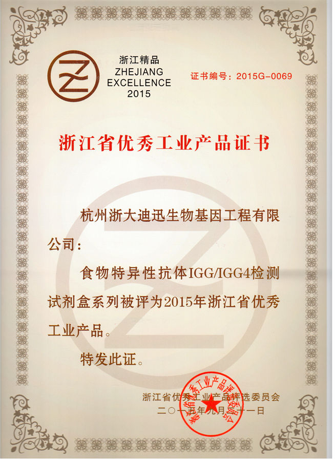 公司于2015年10月12日參加了在杭州之江飯店舉辦的“2015浙江省企業(yè)領(lǐng)袖峰會(huì)”,浙江省常務(wù)副省長(zhǎng)袁家軍出席會(huì)議并作重要講話,省人大、省政協(xié)及相關(guān)部門領(lǐng)導(dǎo)蒞臨會(huì)議,會(huì)上發(fā)布并表彰了2015年浙江省優(yōu)秀工業(yè)產(chǎn)品榜單,我公司的“過敏原特異性抗體IgE檢測(cè)試劑盒系列”和“食物特異性抗體IgG/IgG4檢測(cè)試劑盒系列”均榮獲該項(xiàng)榮譽(yù),表示祝賀!